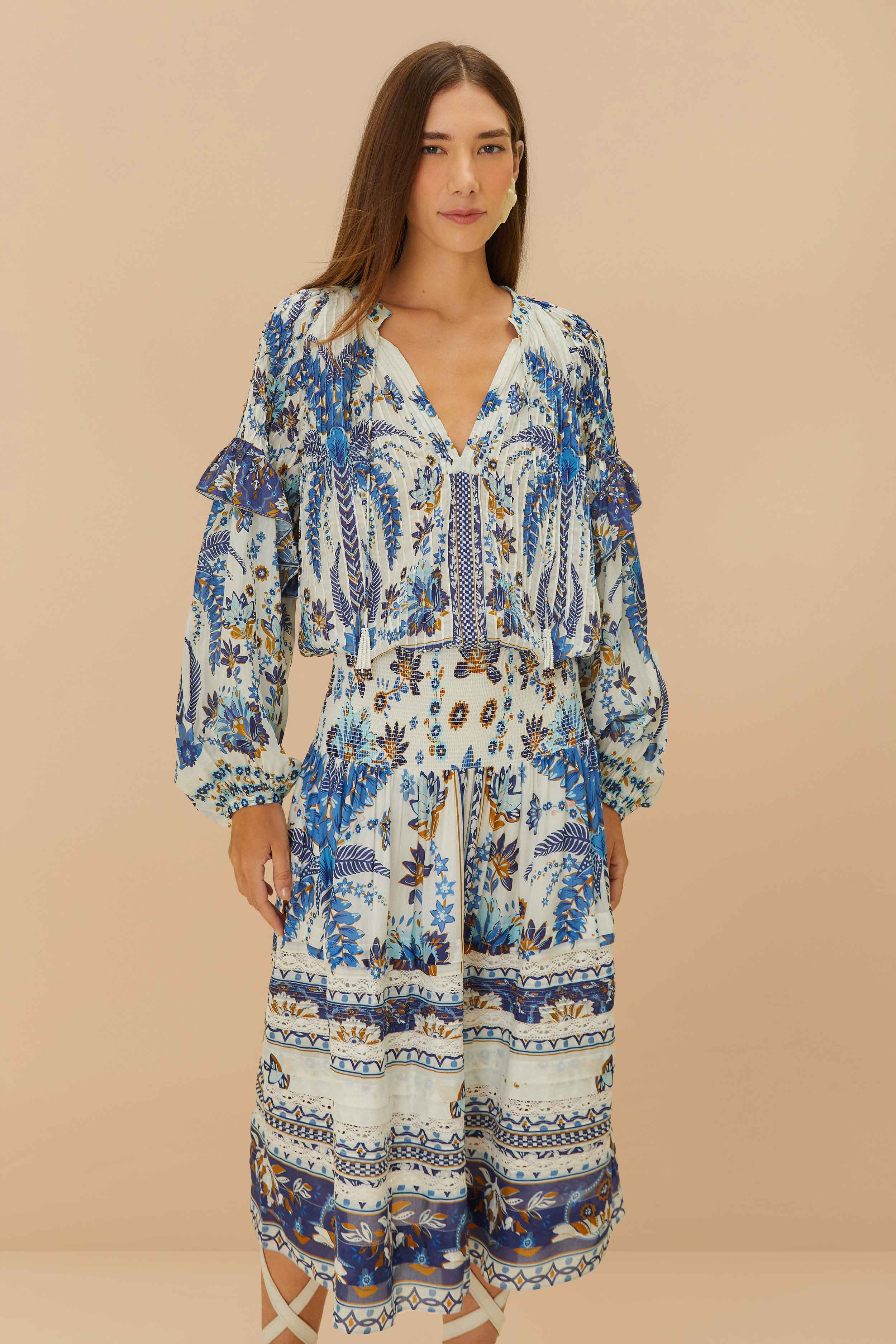 Embrace enchantment with the Off-White Ana Tapestry Organic Cotton Midi Skirt. Adorned with intricate floral and geometric patterns in serene blues and earthy tones, this skirt captures a harmonious blend of artistry and nature. Crafted from responsible materials, its flowing silhouette and gentle pleats create an effortless elegance. Elevate your wardrobe with a piece that resonates warmth and playful charm.GOTS-certified organic cotton has a lower environmental impact than conventional cotton, as it reduces water usage, greenhouse gas emissions, and the amount of chemicals used.