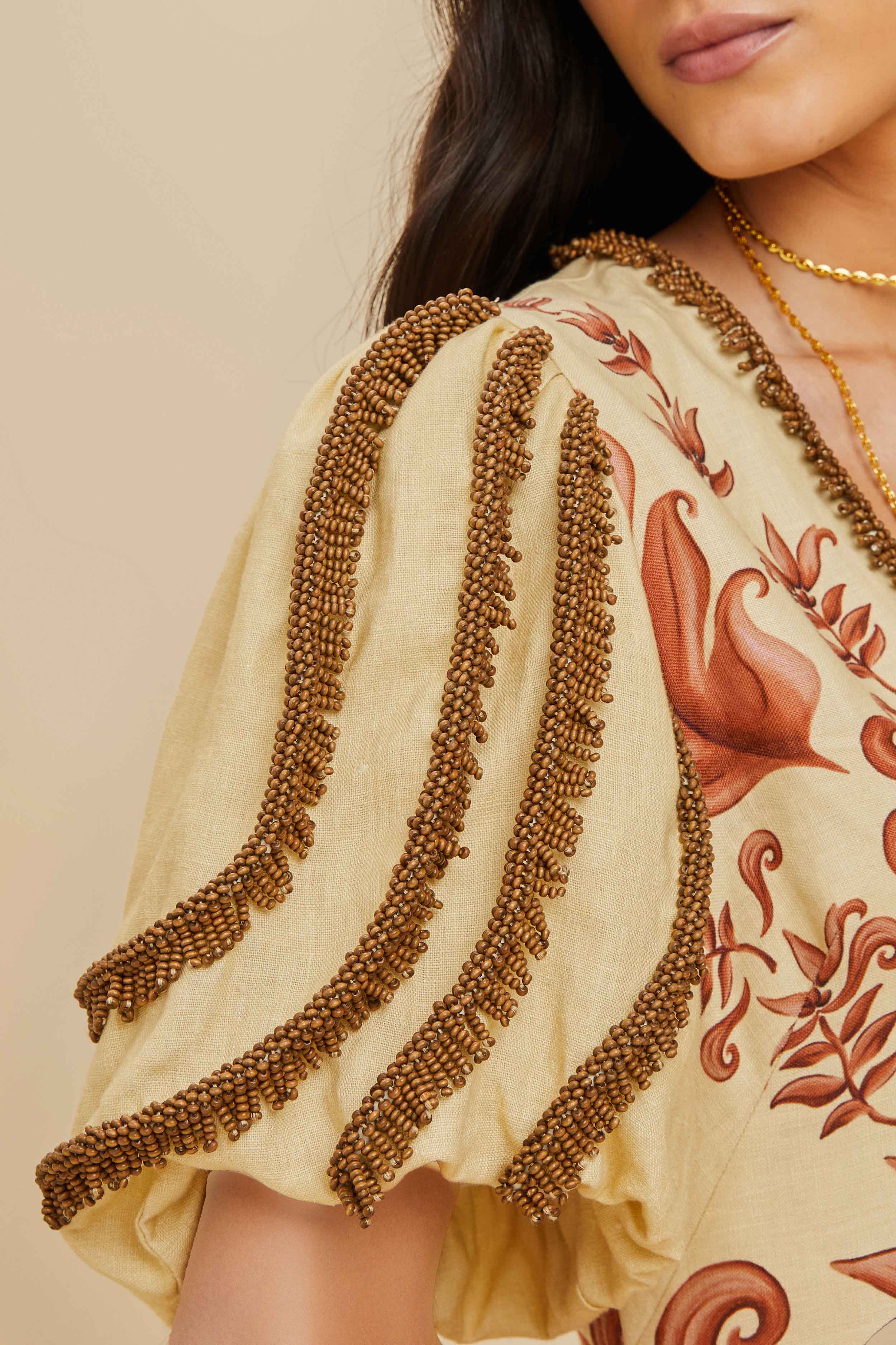 Step into effortless elegance with the off-white Milani Euroflax™ premium linen maxi dress. Adorned with exquisite embroidery, this piece features an inviting V neckline and gracefully puffed sleeves, creating a harmonious blend of sophistication and playfulness. The warm earthy tones dance beautifully across the responsibly crafted fabric, while intricate patterns evoke a sense of timeless charm. Embrace the artistry in every thread with this captivating creation.