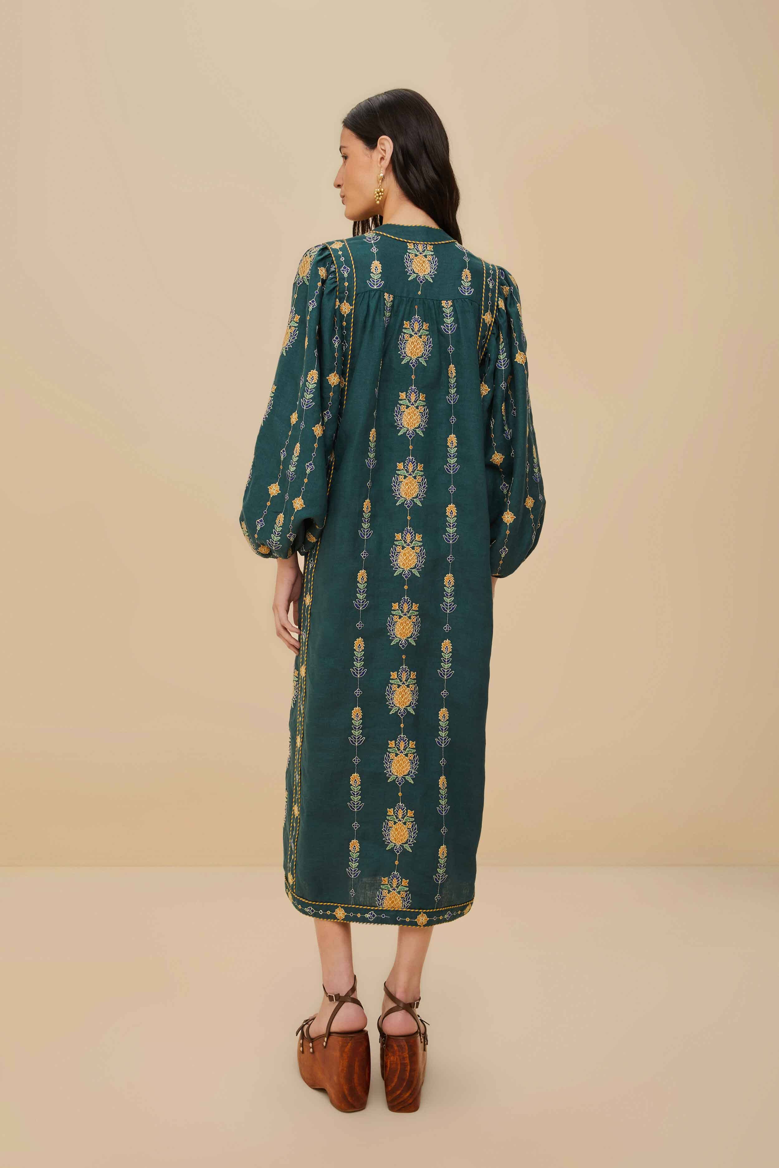 Green Pineapple Embroidered Euroflax™ Premium Linen Tunic Maxi Dress