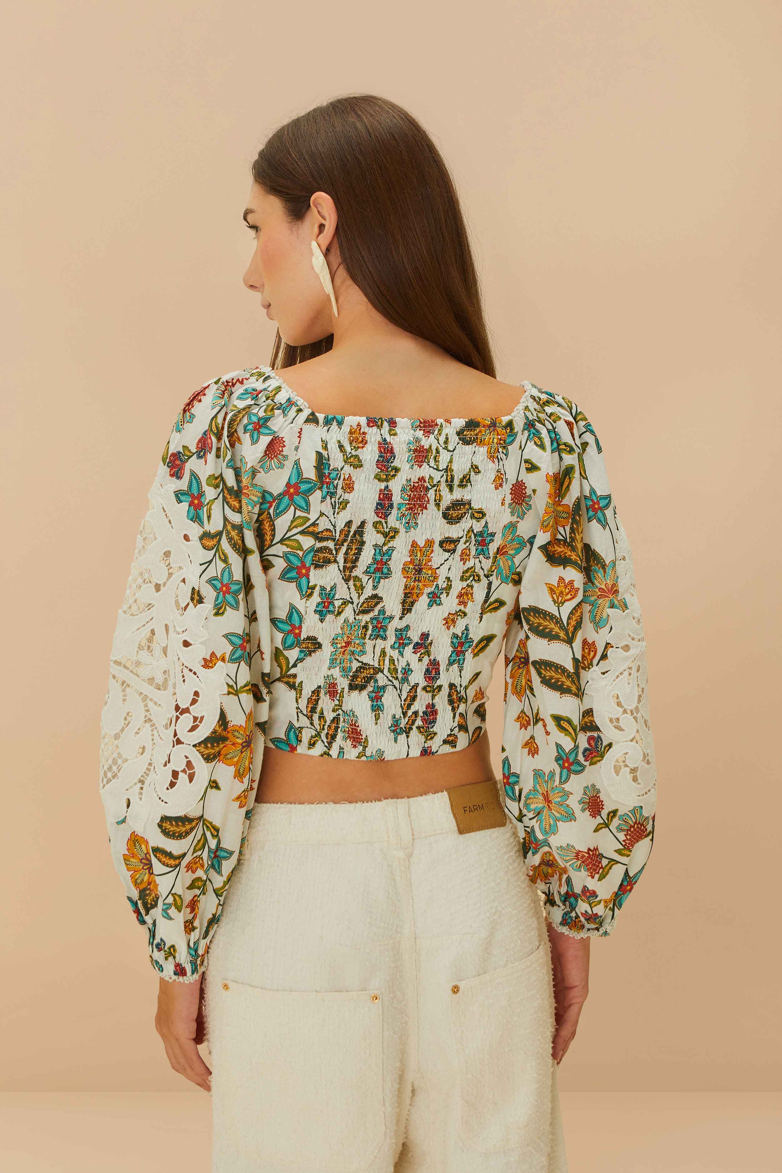 Embrace the playful charm of the Off-White Botanicals Lace Blouse from FARM Rio. This delicate piece features a square neckline, adorned with vibrant floral patterns that dance across the fabric. The blouse's enchanting lace details and airy balloon sleeves evoke a sense of whimsical elegance, making it a perfect blend of warmth and style. Add it to your wardrobe for a touch of botanical delight.FARM Rio
